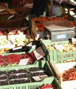 Fruits et légumes de saison, raisinée et jus de pomme.